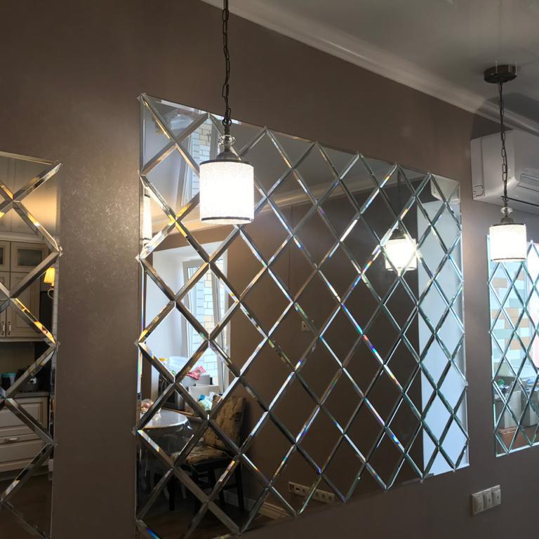 Использована зеркальная квадратная и треугольная плитка с фацетом.